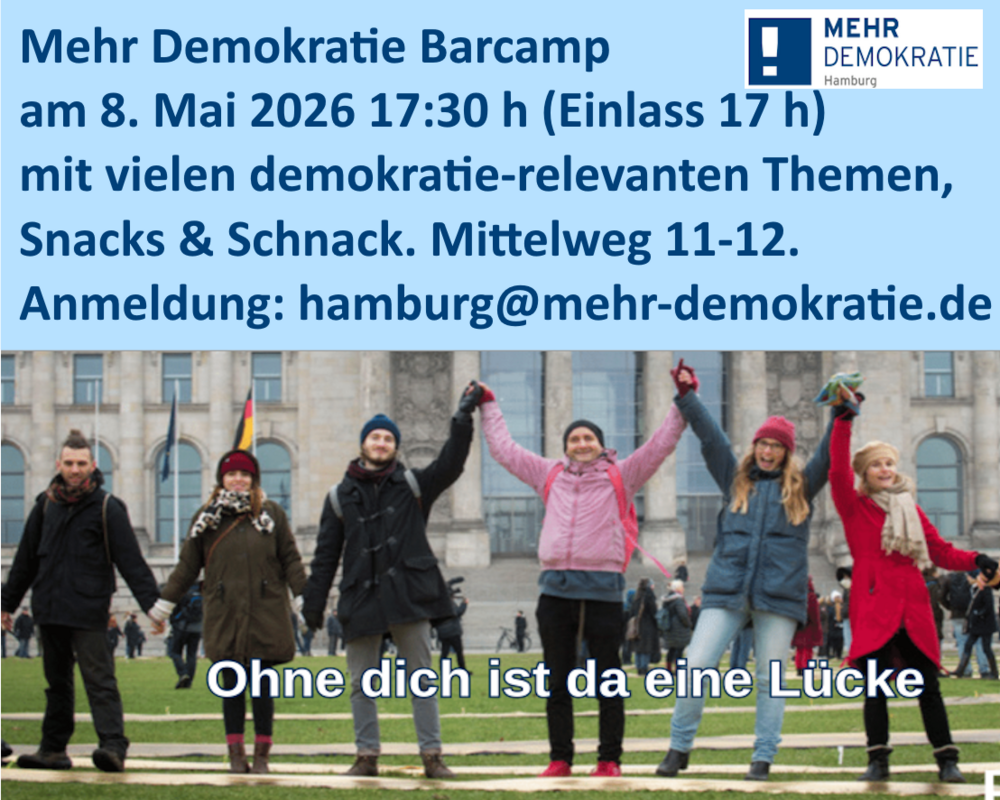 Bitte rechtzeitig anmelden, damit genügend Snacks und Getränke da sind: hamburg@mehr-demokratie.de