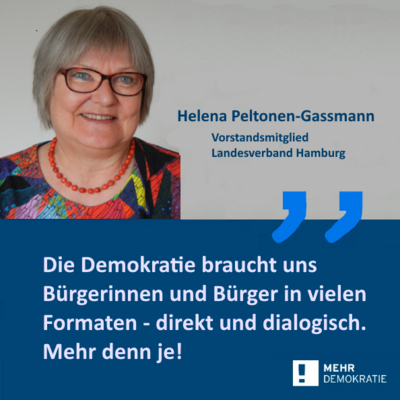 "Diese Instrumente bilden unzweifelhaft eine der Grundlagen der fest verankerten demokratischen Haltung der Hamburgerinnen und Hamburger", ist Vorständin im Landesverband des Vereins, Helena Peltonen-Gassmann, überzeugt. „Anstatt kurzsichtig Hand an die direkte Demokratie zulegen, sollten Senat und Bürgerschaft den dialogorientierten Formen der Bürgerbeteiligung in Hamburg eine umfassende und verlässliche Basis geben“, ergänzt sie.